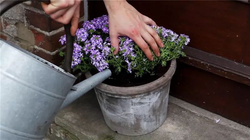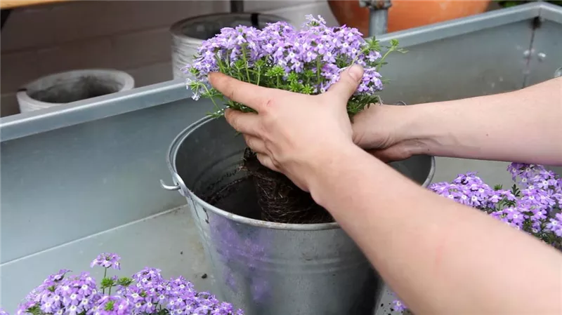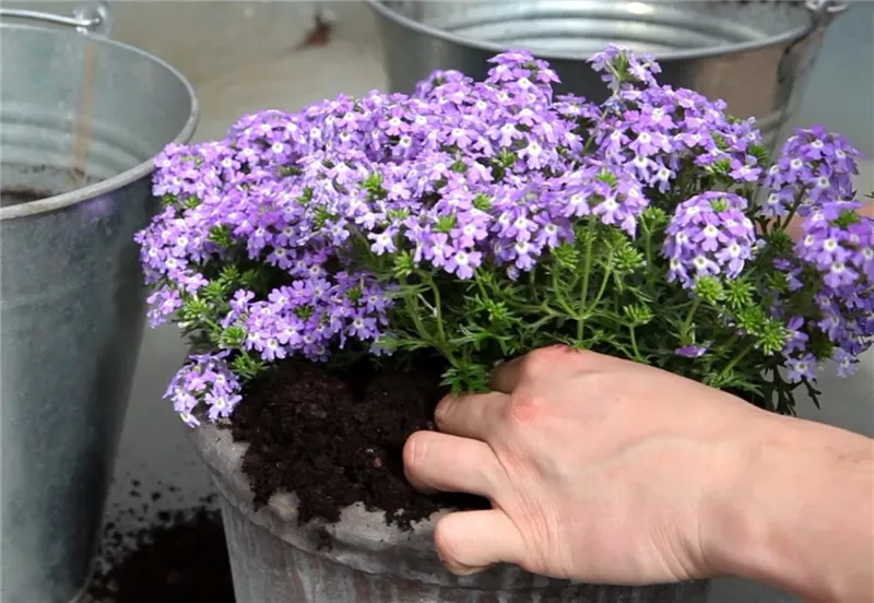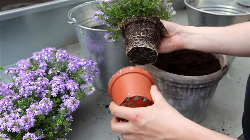 Um die Pflanze zu neuem Wurzelwachstum anzuregen, empfiehlt es sich, den Wurzelballen etwas aufzulockern; besonders wenn das Eisenkraut den alten Topf bereits stark durchwurzelt hat.