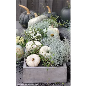 Menschen, die es modern mögen, oder Designästheten werden sicherlich die weiß-graue Deko-Variante des Kürbisses bevorzugen. Dazu einen schlichten Betonkasten zweidrittel mit Erde füllen, je eine Stacheldraht-, Mühlenbeckien-, Heiligenkraut-, Schneebeeren- und Chinesische Narrenkappenpflanze gegen­einander versetzt einsetzen und in die Zwischenräume sowie auch neben den Kasten einige weiße und gräuliche Kürbisse legen.