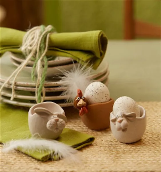 Trendige Deko-Eier aus Stein und glänzende Vasen bringen moderne, nicht zu aufdringliche Osterstimmung in den „Grüner Wohnen!“-Trend. Türkränze in naturbelassenen Farben und Materialien unterstreichen den Stil gekonnt. Wer es eine Spur niedlicher mag, setzt beim Osterfrühstück sein Frühstücksei in hübsche Eierbecher in Tierfiguren wie z.B. Hase oder Schaf. Charmante Hasenfiguren aus Holz finden überall ihren verdienten Platz. Der „Grüner Wohnen!“-Trend wird bestimmt durch die Farben Antikgold, Creme, Sand und natürlich alle Grüntöne.