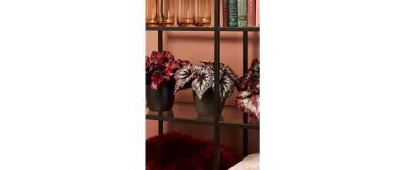 Korbmarante, Philodendron und Blattbegonie sehen besonders attraktiv in einem bordeaux-goldfarbenen Pflanztopf aus. Die bezaubernden Farben der Blätter der Zimmerpflanzen kommen darin besonders gut zur Geltung und stehen im Mittelpunkt der 'GOLDEN TOUCH' Zimmereinrichtung.