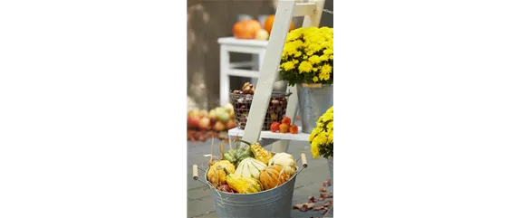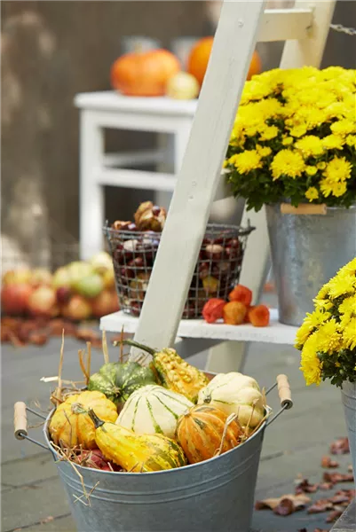 Dekorative Zierkürbisse (Cucurbita pepo), alleine platziert oder in einer Gruppe, sind ein echter Hingucker. Mit ihren verschiedenen Farben in Grün, Gelb, Orange und Formen in lang, oval oder rund sind sie angesagte Begleiter für die herbstliche Gestaltung auf Ihrer Terrasse oder Ihrem Balkon.